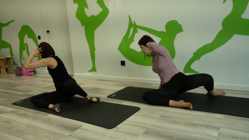• Стопа прямой (левой) ноги может быть развернута вверх (как у девушки на фото позади — это, кстати, я, всем привет) или оставаться на полу (как у инструктора). Разворот стопы вверх усиливает растяжку внутренней поверхности бедра.