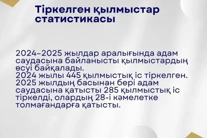 “Қайсар” қорының жетекшісі Оксана Тарабукинаның ұсынған статистикалық деректерінде 2024 жылы 445, ал 2025 жылдың басынан шамамен тамыз айларына дейін 285 қылмыстық істің тіркелгені көрсетілген.